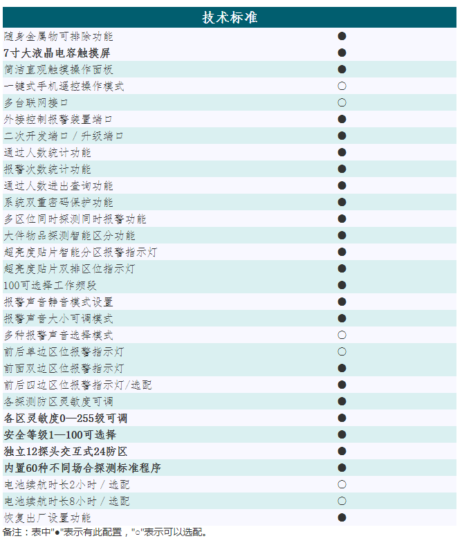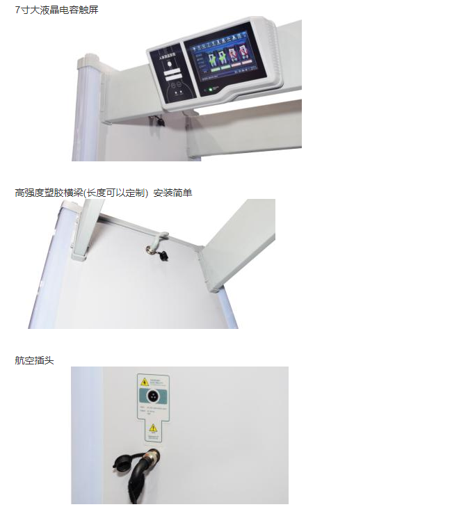 該款高性能安檢門具有以下優點:金屬探測靈敏度較高; 抗干擾能力強; 多個探測區域,每個區域都可以單獨設置靈敏度; 自診斷程序,上電自檢; 7寸大液晶電容觸屏;采用高強度材料,能防火,防腐蝕,防震等;可以實時監視的背景環境干擾。