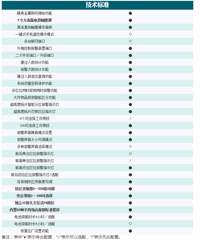 該產品獲得多項外觀機構專利,并已獲得軟件系統注冊版權。該款產品系利用電磁場檢測隨身金屬物的探測結構,以聲光報警的方式來表示通過者隨身金屬物超過一定量。它由主機、高頻信號發生器、信號接收器和紅外線傳感器等組成。具有外形大氣美觀、金屬探測能力較強、探測防區多、獨特的互聯網遠程操作管理系統、輕便、防水的特點,可以拆裝為8塊組成部件,可以方便的攜帶和轉運,是目前領先在市場前沿的便攜式安檢門。